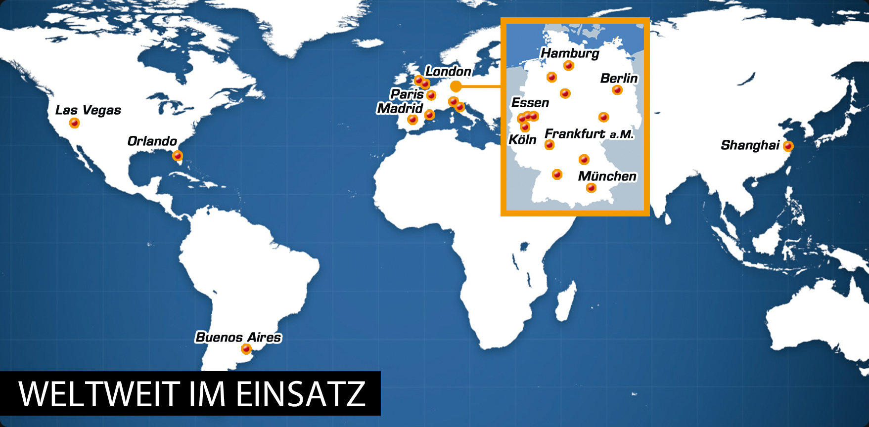 Wir bieten Ihnen für jeden Anspruch und für jedes Budget, auch bei knappen Deadlines, die passende Lösung. Unsere langjährige Erfahrung und das Know-how von zahlreichen Messen und Events unterstreichen unsere Position als Marktführer in Europa. Auf Wunsch kümmern wir uns um den Aufbau und die Vor-Ort-Betreuung, arbeiten aber auch gerne mit Agenturen und Messebauern zusammen.